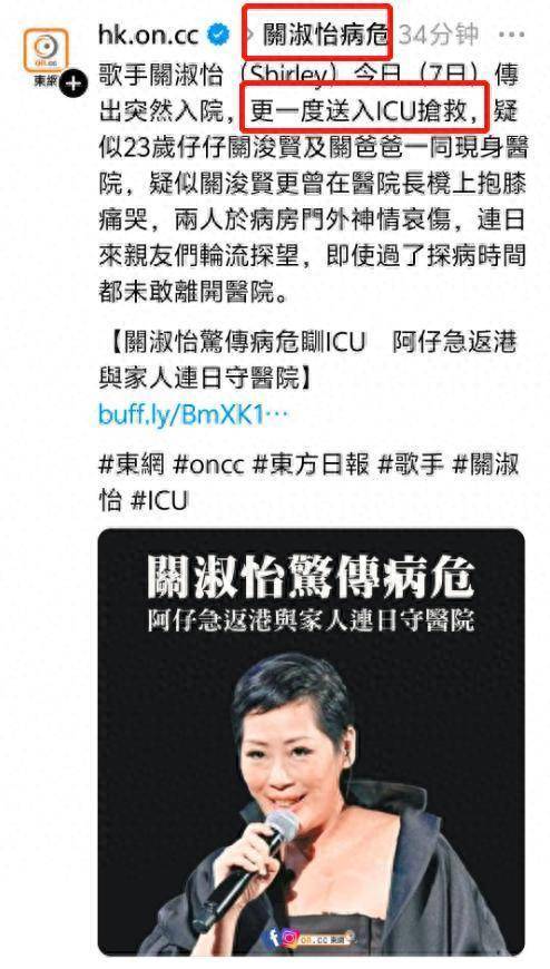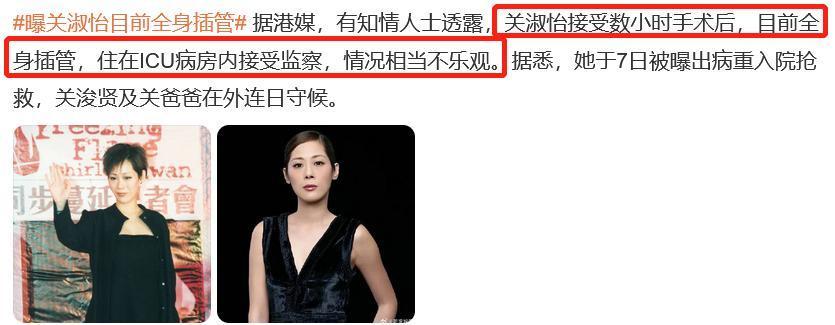 10月9号,知情人透露,经过数小时的手术后,关淑怡全身插满管子,住在ICU里。
