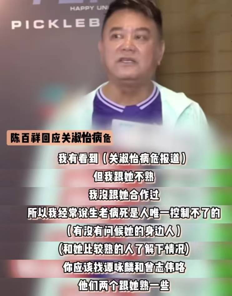 当记者想从陈百祥处打听关淑怡的消息时,陈百祥直言自己和她不熟,记者应该去问和她关系较好的谭咏麟和曾志伟,并表示,生老病死是人无法控制的事情。